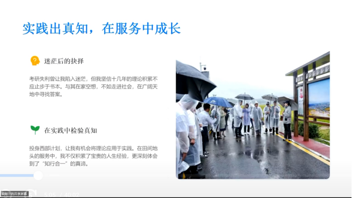 分享会上,爱如汗以自身经历为切入点,坦诚讲述了考研失利后的迷茫与抉择。她表示,十余载的理论学习不应囿于书本,在短暂调整后,她选择投身西部计划,在吉林省延边州光东村的基层服务中,将专业知识转化为实践能力,在田间地头的服务里积累了宝贵人生经验,深刻体悟到“知行合一”的真谛,也让自己从迷茫走向坚定,找到了青春的奋斗方向。