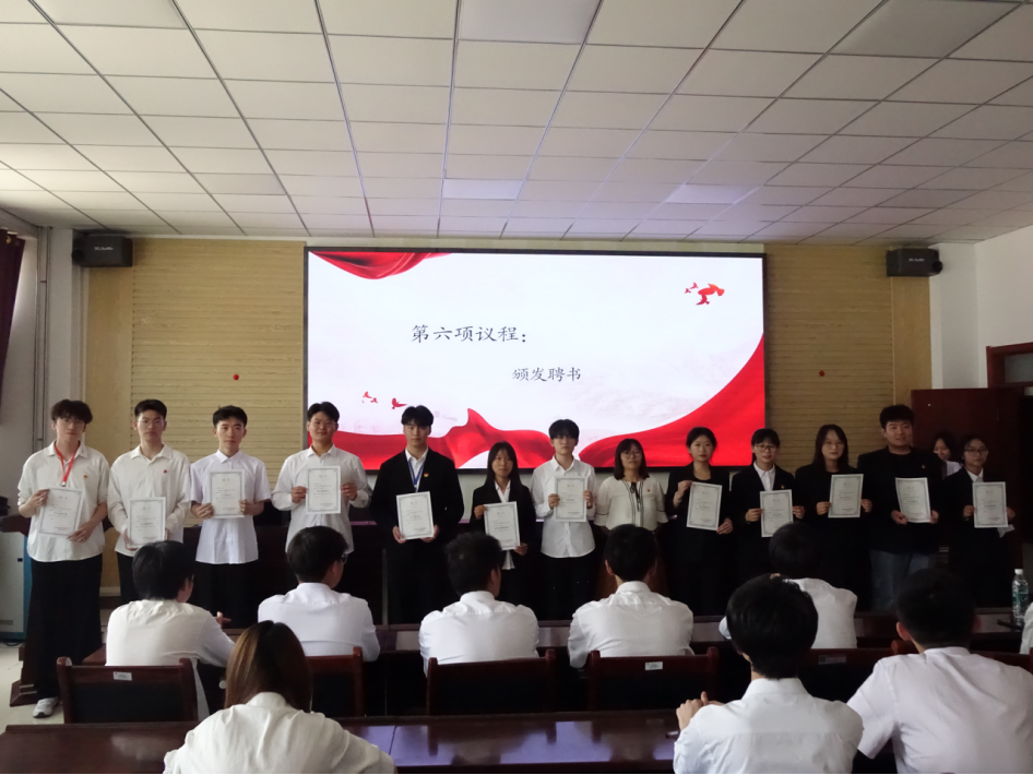 第十三届团总支·学生会学生干部颁发了聘书并为本次大会做总结讲话。提出作为学生干部应该具有政治意识、担当意识、服务意识。最后对第十三届团总支学生会全体成员的努力提出表扬以及对十四届团总支学生会工作给予更高期许,希望立博学生会继续发扬光大。