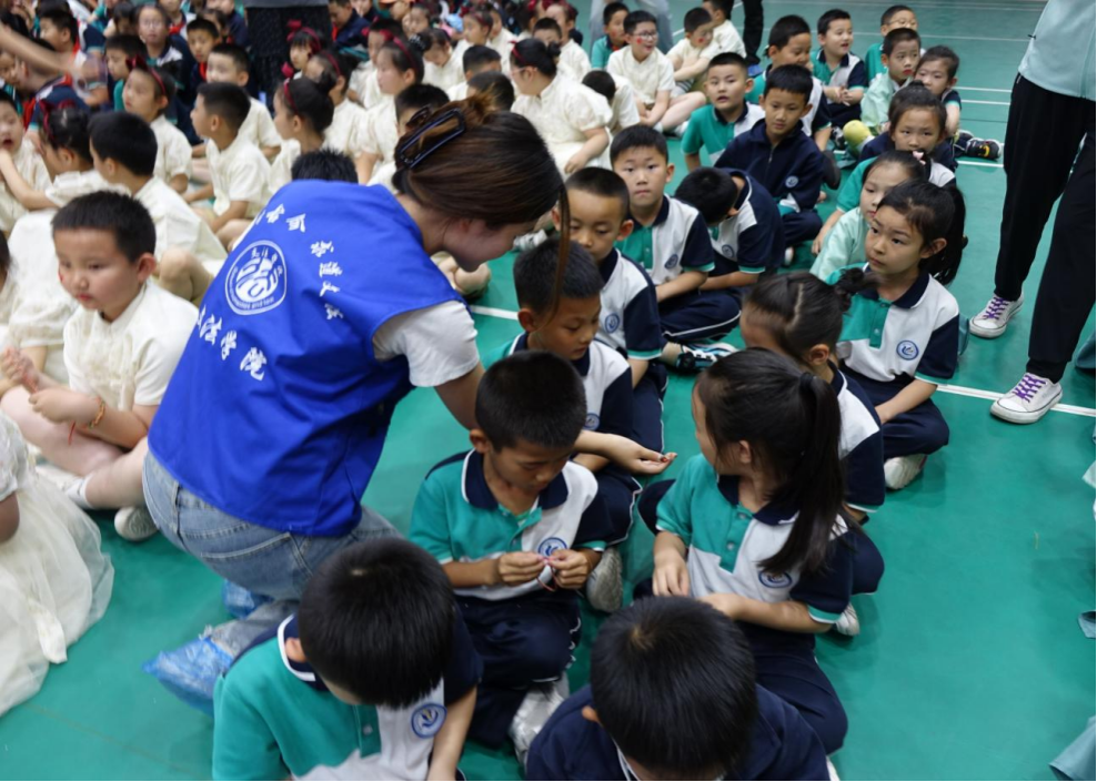 学子为小学生发放五彩绳,传递了节日的美好祝愿,营造了文明祥和的节日氛围。