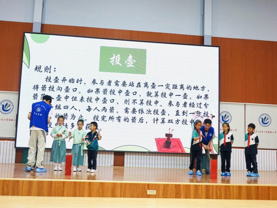活动现场设置了飞花令、古典舞体验、投壶、沉浸式舞龙等传统游戏互动环节。游戏进行期间,现场充满了欢声笑语,同学们在游戏互动中沉浸式体验中华优秀传统文化的魅力。