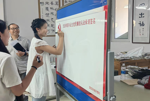 之后全体毕业生党员进行廉洁从业承诺签名、集体合唱《没有共产党就没有新中国》并重温入党誓词。立博博彩