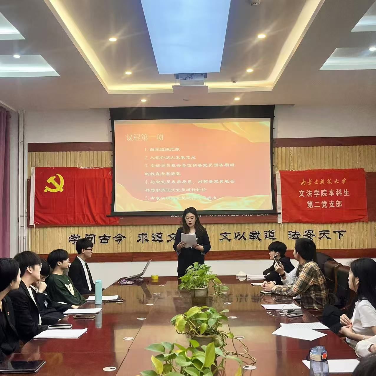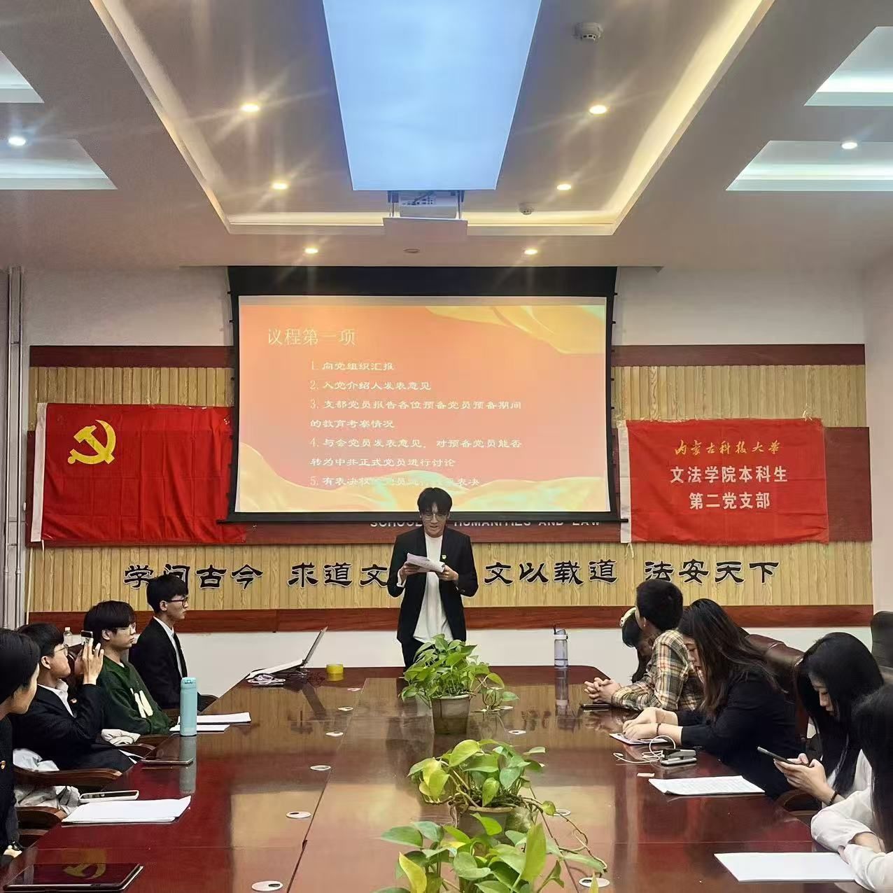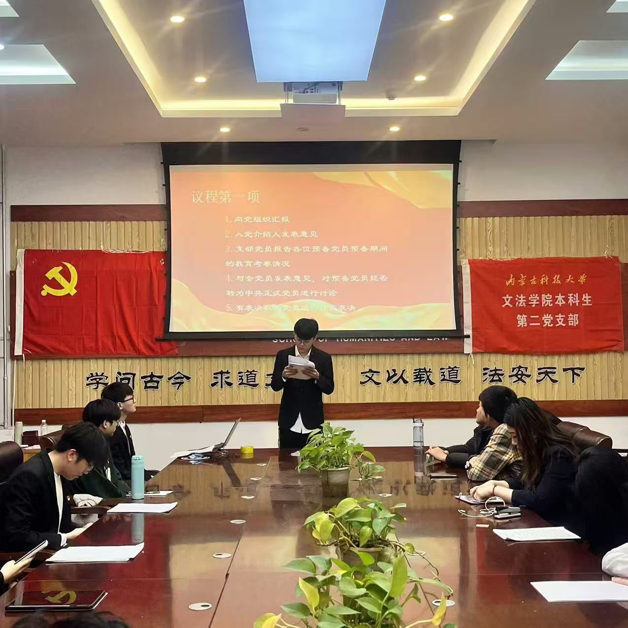 大会由党支部书记主持,全体党员参加。会议开始,全体党员起立奏唱国歌。党支部书记介绍会议流程与到会情况。