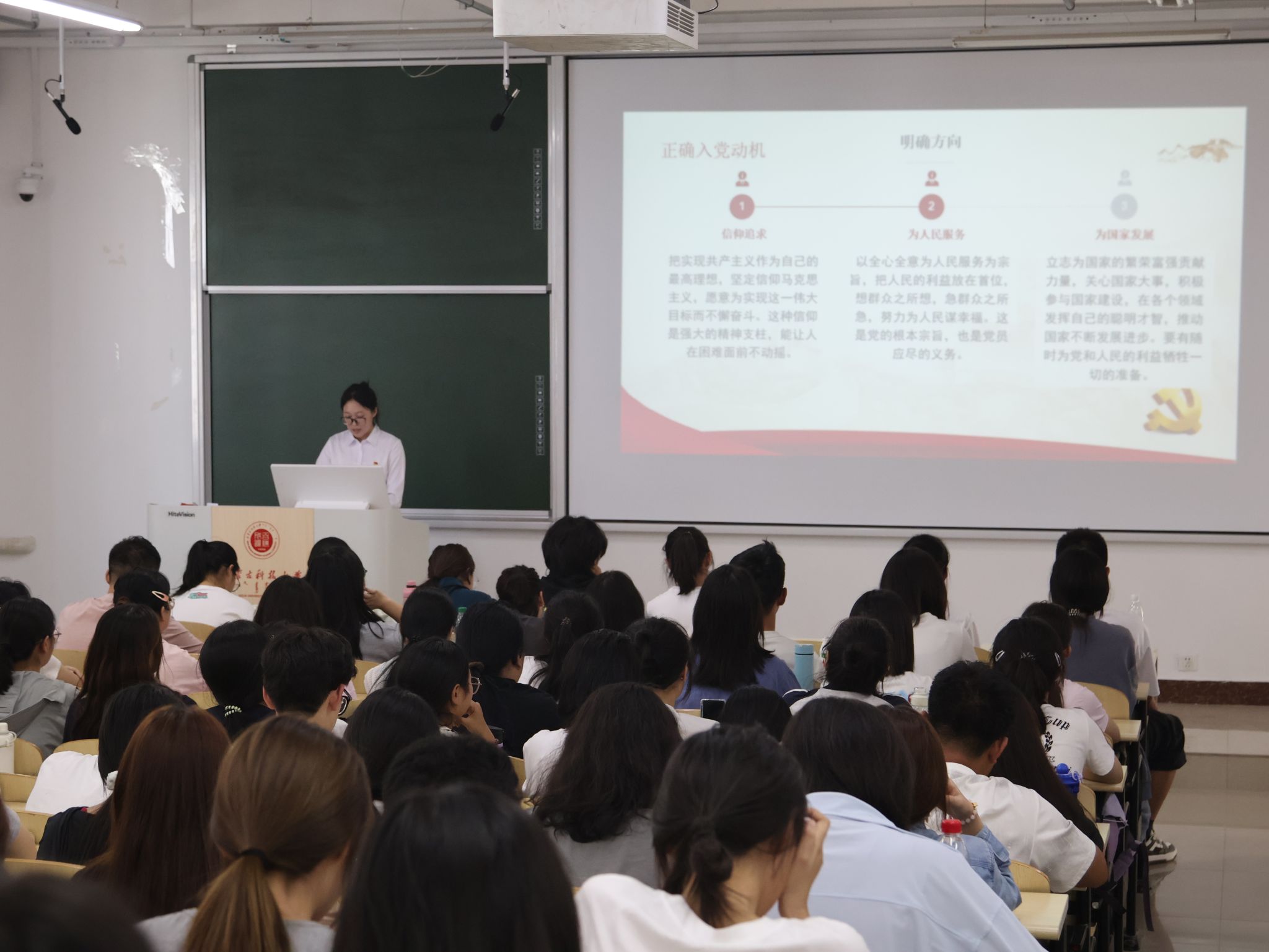 最后,张欣然同志以“端正入党动机”为核心,围绕“为何入党”“入党为了什么”展开分享。结合党的宗旨与新时代青年使命,剖析端正动机的重要性,引导新生树立“为人民服务”的信念,明确入党不仅是身份的转变,更是责任与担当的体现。