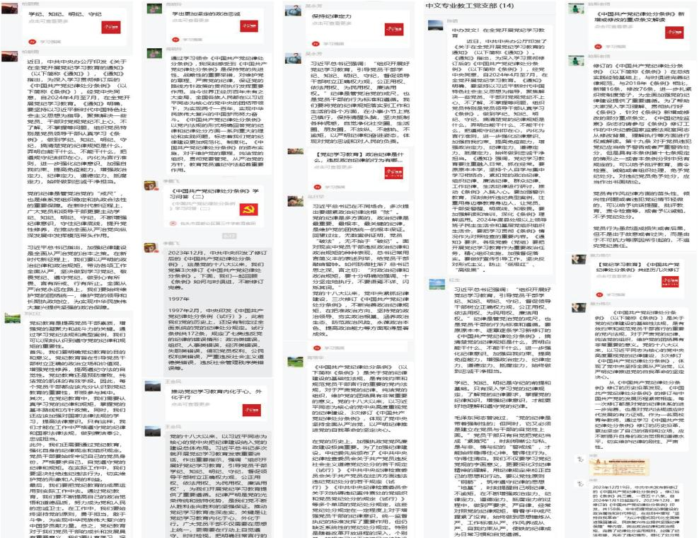 为深入学习贯彻习近平总书记关于党纪学习教育重要讲话和重要指示精神,认真落实中共中央办公厅印发的《关于在全党开展党纪学习教育的通知》要求,进一步增强党员学纪、知纪、明纪、守纪的底线思维,把遵规守纪印刻在心,做实做细党员纪律教育,中文专业教工党支部积极探索创新学习教育形式,依托微信群,开展主题为“每日一学习”的党纪学习教育“微党课”,推动理论教育入心入脑,提升学习效能。