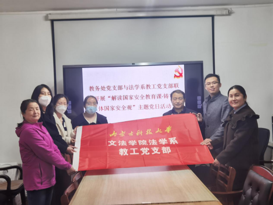 为深入贯彻落实总体国家安全观,增强全民国家安全意识,4月13日下午,在我国第八个全民国家安全教育日之际,法学系教工党支部与教务处党支部在行政楼B203会议室联合开展“解读国家安全教育课·铸牢总体国家安全观”主题党日活动。