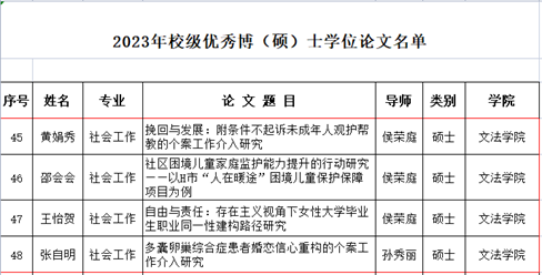 初选,并由校第30届博硕士学位评定委员会第二次会议评审通过,社会工作硕士教育中心2023届毕业生共有4篇学位论文获评2023年校级优秀硕士学位论文。分别是由侯荣庭副教授指导,黄娟秀同学撰写的《挽回与发展:附条件不起诉未成年人观护帮教的个案工作介入研究》、邵会会同学撰写的《社区困境儿童家庭监护能力提升的行动研究——以H市“人在暖途”困境儿童保护保障项目为例》、王怡贺同学撰写的《自由与责任:存在主义视角下女性大学毕业生职业同一性建构路径研究》和由孙秀丽副教授指导,张自明同学撰写的《多囊卵巢综合症患者婚恋信心重构的个案工作介入研究》。