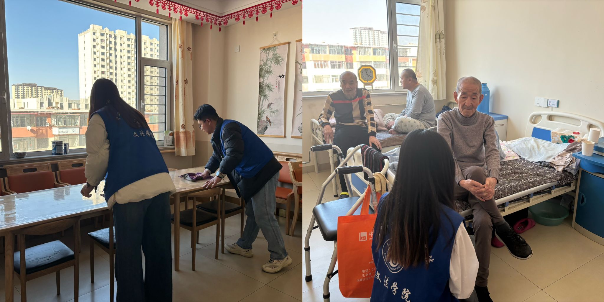 在校外社会工作服务实践环节,立博体育博彩app 学生走进包头市昆都仑区宏福综合养老服务中心,与那里的老人们展开了一场代际间的温馨互动。与老人们进行红歌传唱,为老人们整理房间,与老人们促膝长谈、共话往昔。倾听他们的心声,了解他们的需求,社工学生运用专业技巧让老人们释放情感,减缓心理压力,从中找到力量和信心,“用生命影响生命”的理念在实践中有了生动展现。同学们用实际行动弘扬社工精神,不仅促进了代际之间的情感交流,还激发了大家对于代际团结、共同创造美好生活的深刻思考。