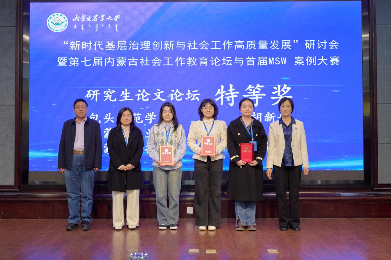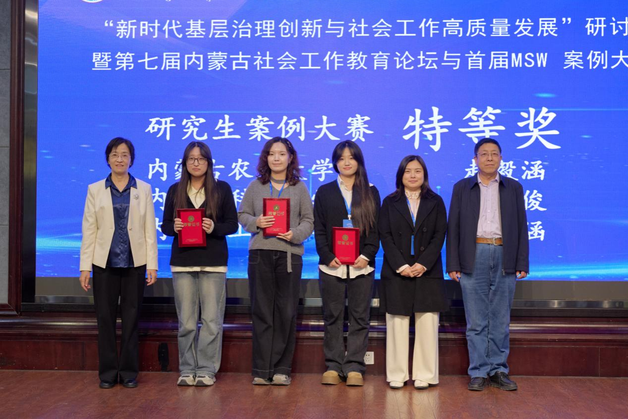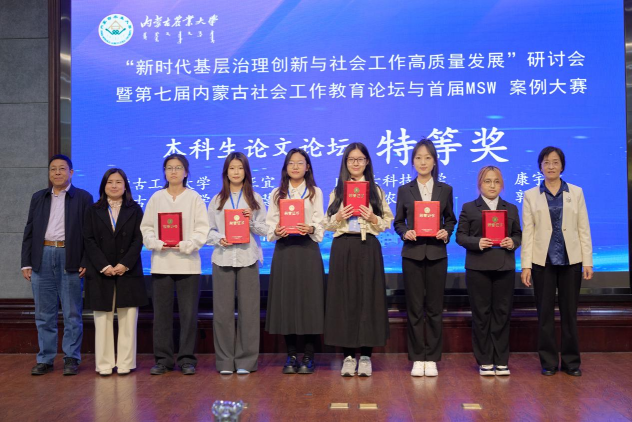 社会工作系侯荣庭副教授、张瑞博士、哈那嘎尔博士、程晨博士与12名社会工作专业学生组成代表队应邀参会,师生团队在学术交流与赛事评选中均表现突出,一举夺得10项大奖,包括特等奖3项、一等奖4项、二等奖3项,实现成绩与影响力的双丰收,充分彰显了我校社会工作专业人才的雄厚实力与培养质量。