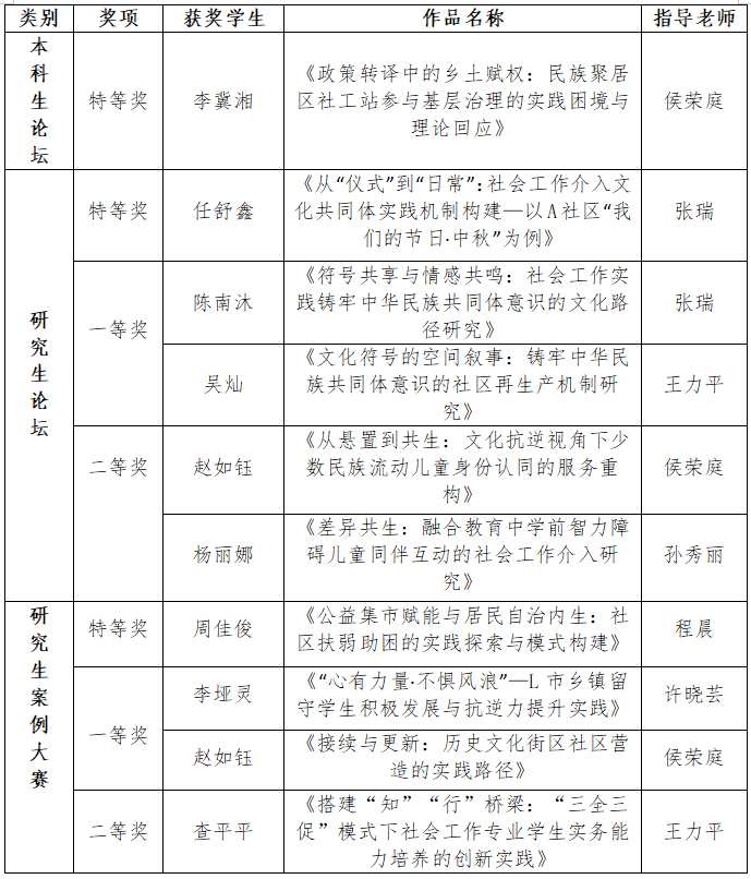 学子聚焦社区治理、乡村振兴、铸牢中华民族共同体意识等前沿议题,作品凭借扎实的理论根基、创新的实践模式和鲜明的时代特色,在评选中脱颖而出。获奖名单如下: