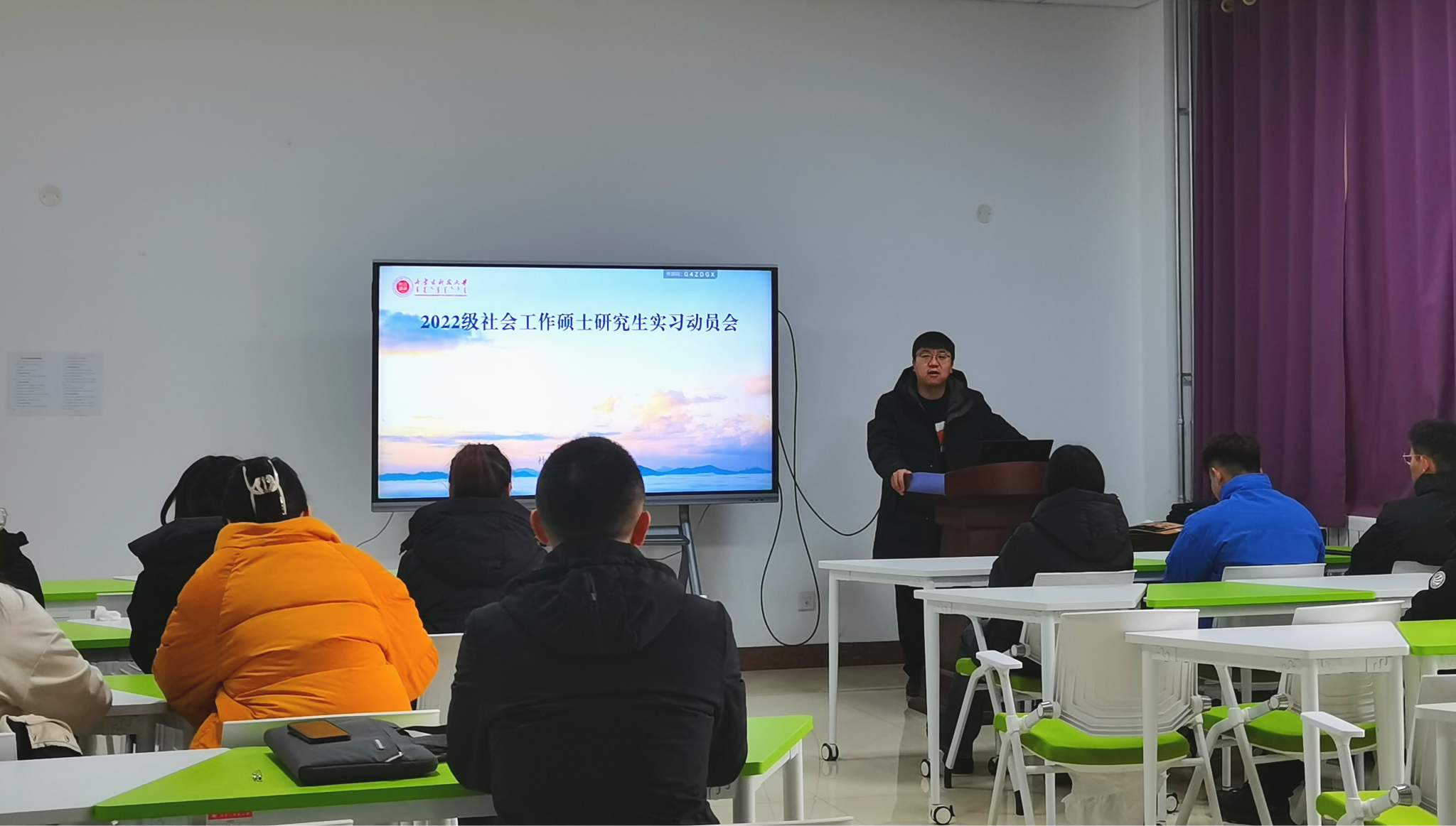 为引导学生做好专业实习前的各项准备工作,保障研究生实习工作有序开展,社会工作硕士教育中心于2024年3月4日上午9点在明德楼A302教室召开2022级社会工作研究生实习动员会。动员会由社会工作硕士教育中心副主任侯荣庭副教授主持,2022级社会工作全体硕士生通过线上和线下相结合的方式参与本次动员会。
