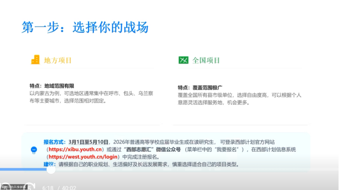 针对同学们最关心的报名与选拔流程,爱如汗进行了细致梳理与重点讲解。她建议同学们结合职业规划、生活偏好慎重选择“全国项目”与“地方项目”——全国项目覆盖全国县市级单位,选择自由度高;地方项目地域范围相对固定,可结合自身需求选择。报名可于3月1日至5月10日,通过西部计划官方网站或“西部志愿汇”微信公众号完成。选拔流程依次为网上心理测试、综合笔试(考察党团理论及志愿服务知识)、结构化面试,她还分享了面试中常见的观点辨析、社会现象分析类题型,提醒同学们平时多关注时事热点,锻炼思辨能力。同时她提到,考试结束1-2周可查询总成绩,若未被录取,后续还有多次补录机会,鼓励同学们保持关注、积极尝试。